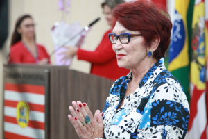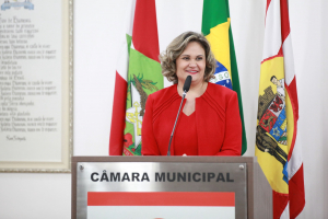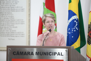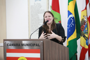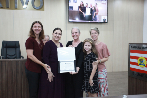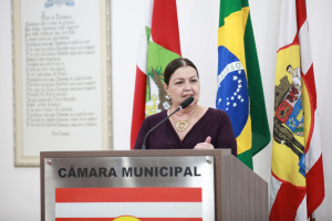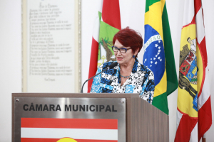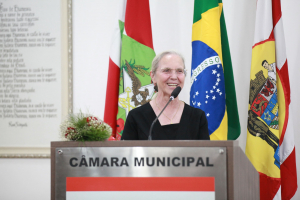 A primeira homenagem da noite foi feita pela vereadora Cristiane Loureiro, que entregou moção de louvor à professora Sueli Maria Vanzuita Petry pelos seus 50 anos de serviço público dedicados ao município de Blumenau. Atualmente, a professora Sueli Petry é diretora do Patrimônio Histórico-Museológico da Secretaria Municipal de Cultura e Relações Institucionais. Cristiane apontou que foi uma honra poder homenagear essa pessoa tão importante para a cultura e história do município. Apontou que o mês de março é duplamente comemorativo, pois também é mês do seu aniversário. “O trabalho dela é feito com dedicação e amor contribuindo até hoje com a cultura do município. É considerada uma das guardiãs da história da cidade por ser uma das pessoas que na atualidade mais conhece a história do município. Apesar de não ser blumenauense de nascimento, seu conhecimento na área de história e sua elegância sempre chamam a atenção de todos. Ela se dedica integralmente ao seu trabalho e em prol do município, servindo com amor, por isso é uma justíssima homenagem desta Casa”, destacou, lembrou que na ocasião também era aniversário dela e foram cantados os parabéns e agradeceu a todos os colegas vereadores que aprovaram essa homenagem.