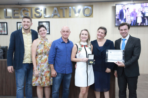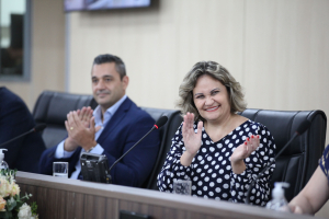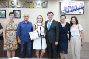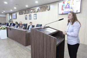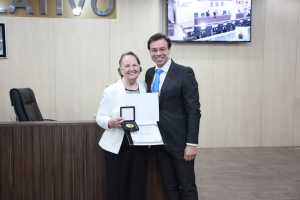 Uma das comendas foi entregue para a diretora geral do Colégio Shalom, Adriana Laurentino Moreira, por proposição da vereadora Silmara Miguel. A parlamentar discorreu sobre a formação e o currículo da homenageada, que é professora, atuando na área da educação por 21 anos. “Você é uma mulher forte, corajosa, determinada, ousada, mas sem perder a docilidade. Uma profissional impecável, que não tem uma carreira, mas sim a missão e o foco de cuidar das pessoas, principalmente dos seus alunos. Dedica a sua vida em prol da educação, mostrando a sua vocação e a riqueza que é viver seus dias no educandário. É uma diretora digna de muitos aplausos de todos e é uma amiga muito querida”, assinalou, falando ainda mais da dedicação que a homenageada têm com os estudantes. Silmara ainda exibiu um vídeo com depoimentos de estudantes para a homenageada.