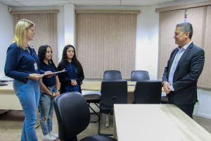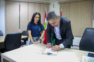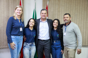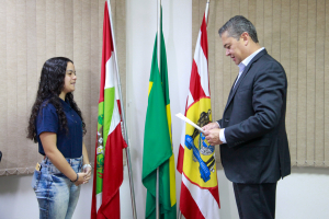 A vereadora mirim suplente Maria Eduarda Zimmermann, representante da Escola Básica Municipal Almirante Tamandaré, tomou posse na Câmara Mirim, na tarde desta terça-feira (11), e assumiu como titular. O presidente da Câmara de Vereadores, vereador Almir Vieira (PP), é quem conduziu a posse no Gabinete da Presidência.