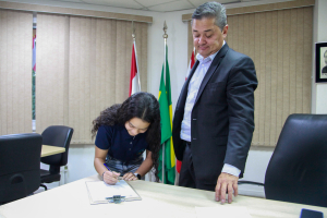 Após fazer o juramento e assinar o termo de posse, a estudante do 8° ano assumiu como vereadora mirim titular na vaga da ex-vereadora mirim Gabriely Chaves, que renunciou ao mandato por motivo de transferência de escola.