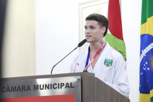 O carateca Kauan Ribeiro, atleta representante da equipe do Karatê Itoupava, ocupou a tribuna durante o Momento da Presidência na sessão ordinária desta terça-feira (5). Kauan destacou a sua conquista do título panamericano de karatê, na categoria sub-21 – 75 kg, em Santiago, no Chile.