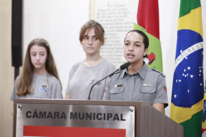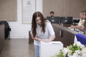 A Coordenadora Regional de Educação, Cleusa Furtado Kratz, parabenizou os vereadores mirins por esse momento e pela decisão de se candidatarem para fazer parte da Câmara Mirim. Ela ressaltou que por trás da decisão e da vontade que os trouxe até aqui existem seus familiares e responsáveis que os apoiaram nesta caminhada. “Ninguém é nada na vida se não tiver alguém por trás. Ninguém é nada sozinho. Todos nós precisamos de alguém do nosso lado. Aproveitem muito esse momento. Façam o seu melhor durante este ano de 2025. A todo dia 1% melhor do que fui ontem e com certeza ao final deste mandato vocês terão dado todo o seu 100% de melhor”, apontou, parabenizando-os.